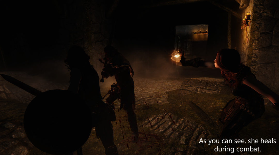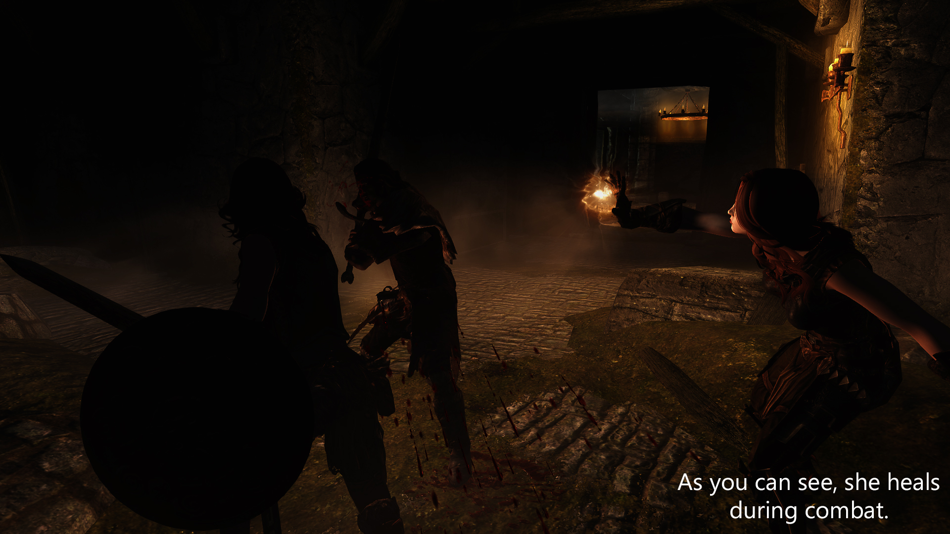She heals you (and followers, if you have them) in combat (and only in combat) when health gets lower than 75%. Watch the video above to get a better image to what I’m saying.